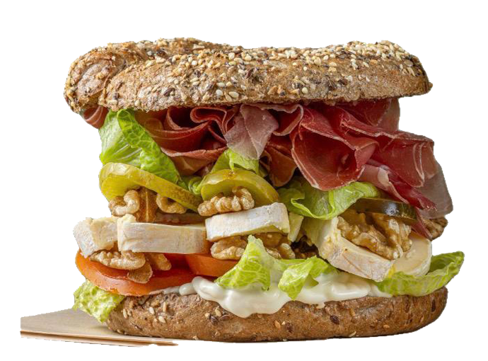 Jambon cru, Tomates, Laitue romaine, Reblochon, Noix, Cornichons sweet pickles, Sauce cream cheese